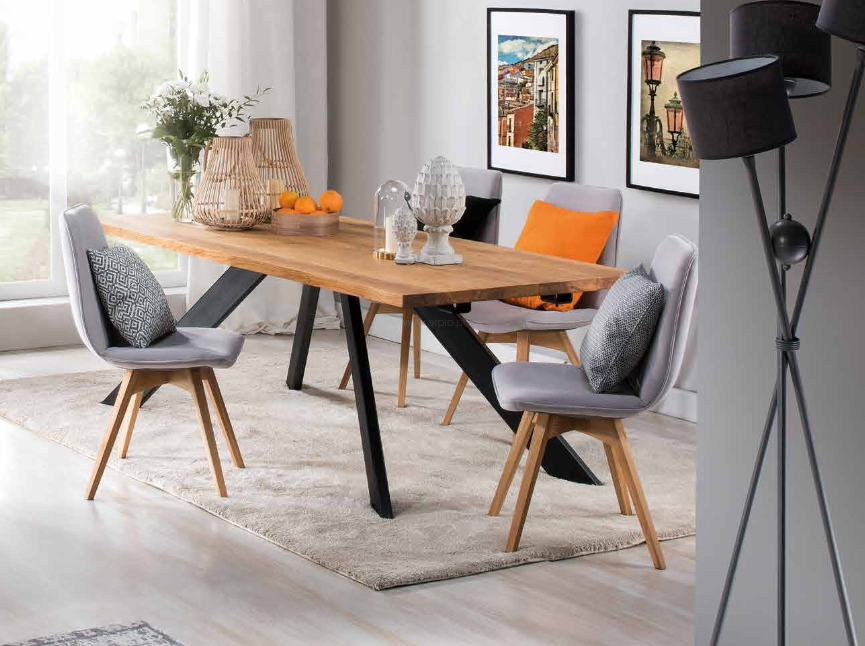 Większość naszego asortymentu stanowią właśnie stoły dębowe. Blat wykonany z drewna litego dębowego o grubości 4 cm. Doskonale uwidoczniona jest w nim struktura drewna, z jego naturalnymi rysami, pęknięciami czy sękami. Nasz produkt wpasuję się w różne style projektowania wnętrz. Świetnie współgra z surowością betonu, kamienia czy cegły.