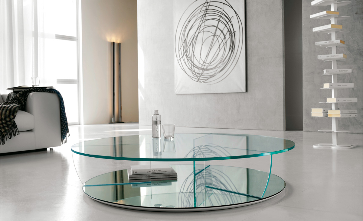 Stolik kawowy Mille Coffee firmy Bonaldo -szklany blat dostępny w różnych kształtach i rozmiarach...