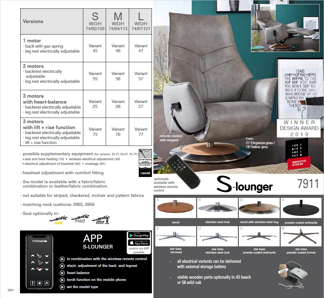 S-LOUNGER 7911 jest dostępny w wielu wersjach o różnych specyfikacjach technicznych i wizualnych. Wersja jednosilnikowa posiada elektryczną regulację podnóżka, natomiast położenie oparcia można zmieniać za pomocą mechanizmu sprężyny gazowej. Model dwusilnikowy wyposażony jest w przyciski umożliwiające elektryczną regulację obu funkcji. Tymczasem wersje trzysilnikowe są wyposażone w funkcję równoważenia serca lub funkcję podnoszenia i podnoszenia. Włącznik ręczny znajduje się z boku krzesła i jest wyposażony w praktyczny magnes. Regulacja elektryczna może być również sterowana za pomocą bezprzewodowego pilota lub na życzenie aplikacji z AppStore.
